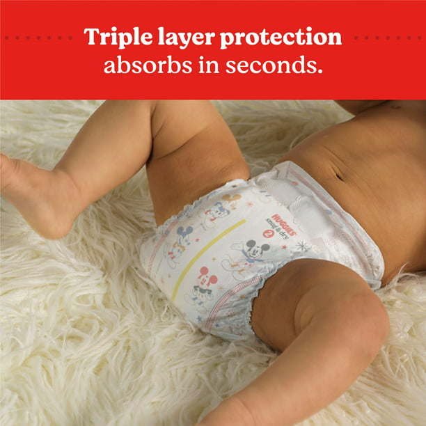 Help give your baby healthy; huggable skin with Huggies Snug & Dry Baby Diapers. These disposable baby diapers offer up to 12 hours of long-lasting protection; day or night; thanks to the Triple Layer Protection. The Triple Layer Protection absorbs wetness in seconds and helps to separate the moisture from your baby's skin. Plus; each diaper has a stretchy waistband and a contoured shape for better leakage protection; no matter what your baby is up to; whether sleeping; walking or crawling. Clinically proven to be hypoallergenic; Snug & Dry contains no harsh ingredients and is free of fragrances; parabens; elemental chlorine and natural rubber latex. A wetness indicator changes from yellow to blue when in contact with moisture; so you always know when your baby is ready for a diaper change. Coming in exclusive Disney Mickey Mouse designs as cute as your baby; Snug & Dry Diapers are available in sizes Newborn (up to 10 lbs); 1 (8-14 lbs); 2 (12-18 lbs); 3 (16-28 lbs); 4 (22-37 lbs); 5 (27+ lbs) and 6 (35+ lbs). Join Huggies Rewards+ powered by Fetch to get rewarded. Earn points on Huggies; in addition to thousands of other products to redeem for hundreds of gift cards. Download the Fetch Rewards app to get started today! (*sizes 3-6)