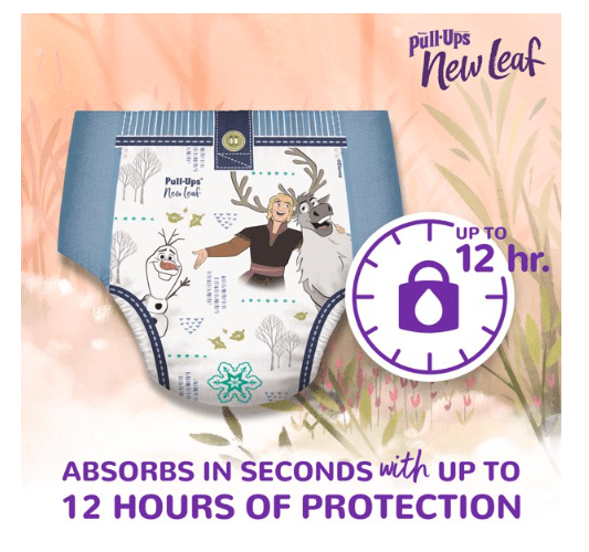 Introducing Pull-Ups New Leaf Training Pants; the softest training underwear made with plant-based ingredients* for healthy skin. Clinically proven to be hypoallergenic and made without harsh ingredients; New Leaf training pants provide up to 12 hours of outstanding leak protection. Made with a cottony-soft & breathable material with high absorbency; New Leaf training pants are designed to help keep your child comfortable while potty training. Pull-Ups New Leaf training pants also feature an underwear like design for easy up & down motion that helps promote learning and Big Kid independence. Plus soft; refastenable sides provide an adjustable waistband for a secure fit and quick changes on-the-go or at home. Featuring your favorite Frozen II characters; each pack includes front & back designs of Disney’s Olaf; Sven & Kristoff; with wetness indicator graphics that fade when wet for a fun way to help him learn. When your child is ready to begin his potty training journey; the Pull-Ups brand can help. Visit pull-ups.com for expert articles; tips and potty training resources. We've helped potty train 60 million Big Kids and counting!** Pull-Ups New Leaf Training Pants are available in sizes 2T-3T (16-34 lb.); 3T-4T (32-40 lb.) and 4T-5T (38-50 lb.). (*28% by weight). (**US and Canada)